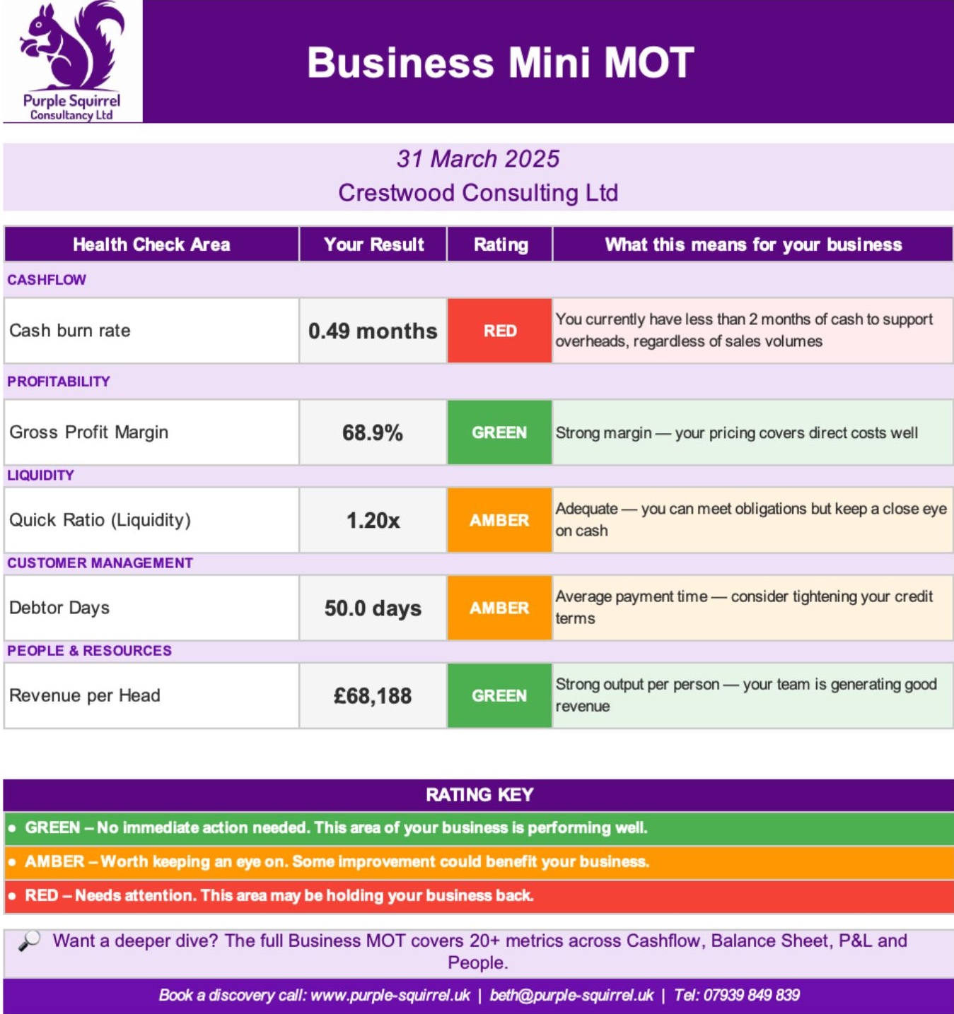 I also wanted to show you what an example of the Mini MOT report would look like, so this report is for a totally fictitious service based company, with 8 full time employees, and shows the report using just those 8 numbers